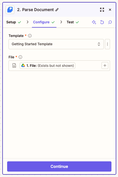 - When adding a Parselyze action, connect your account using your API key (find it in your Parselyze dashboard under Account → API Keys).